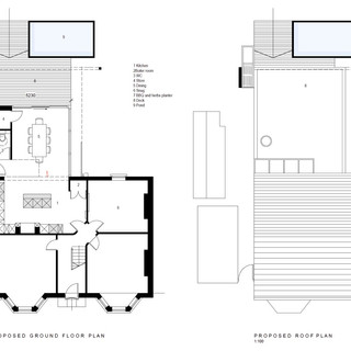 The proposal extends the kitchen in the garden with a glazed dining room. It also includes a store and a downstairs toilet.